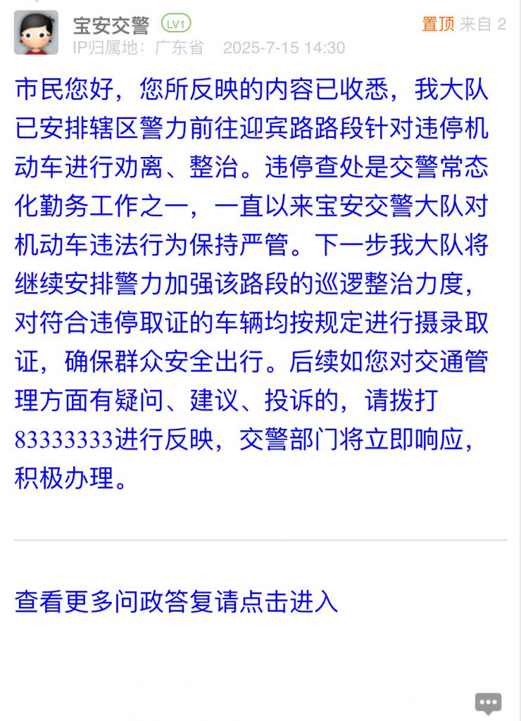 市民您好,您所反映的內(nèi)容已收悉,我大隊已安排轄區(qū)警力前往迎賓路路段針對違停機動車進行勸離、整治。違停查處是交警常態(tài)化勤務(wù)工作之一,一直以來寶安交警大隊對機動車違法行為保持嚴管。下一步我大隊將繼續(xù)安排警力加強該路段的巡邏整治力度,對符合違停取證的車輛均按規(guī)定進行攝錄取證,確保群眾安全出行。后續(xù)如您對交通管理方面有疑問、建議、投訴的,請撥打83333333進行反映,交警部門將立即響應(yīng),積極辦理。