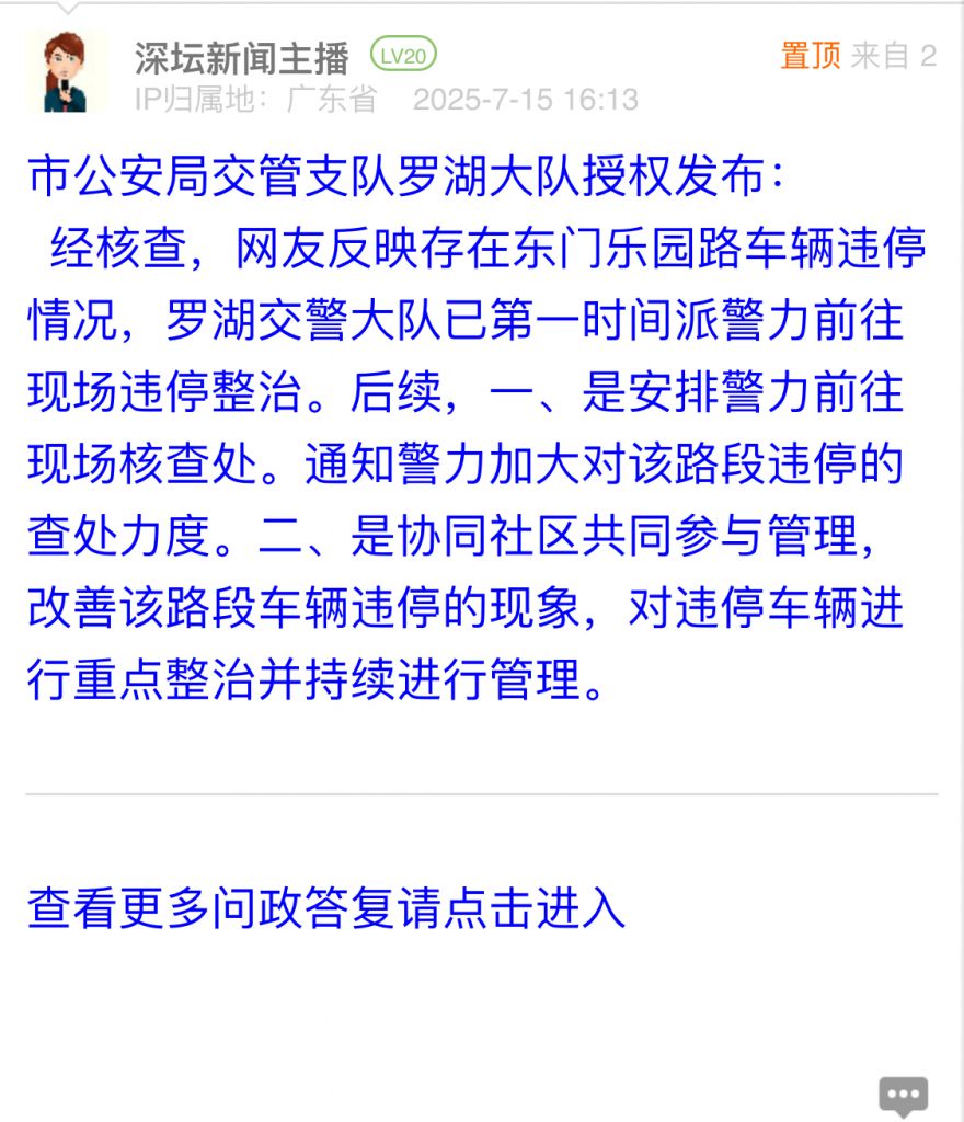 經(jīng)核查,網(wǎng)友反映存在東門樂園路車輛違停情況,羅湖交警大隊已第一時間派警力前往現(xiàn)場違停整治。后續(xù),一、是安排警力前往現(xiàn)場核查處。通知警力加大對該路段違停的查處力度。二、是協(xié)同社區(qū)共同參與管理,改善該路段車輛違停的現(xiàn)象,對違停車輛進行重點整治并持續(xù)進行管理。