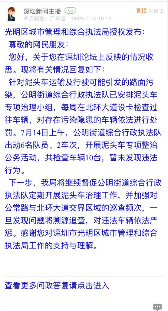 下一步,我局將繼續(xù)督促公明街道綜合行政執(zhí)法隊定期開展泥頭車治理工作,并加強對公常路與北環(huán)大道交界區(qū)域的巡查頻次,一旦發(fā)現(xiàn)問題將溯源追查,對違法車輛依法嚴懲。感謝您對深圳市光明區(qū)城市管理和綜合執(zhí)法局工作的支持與理解。