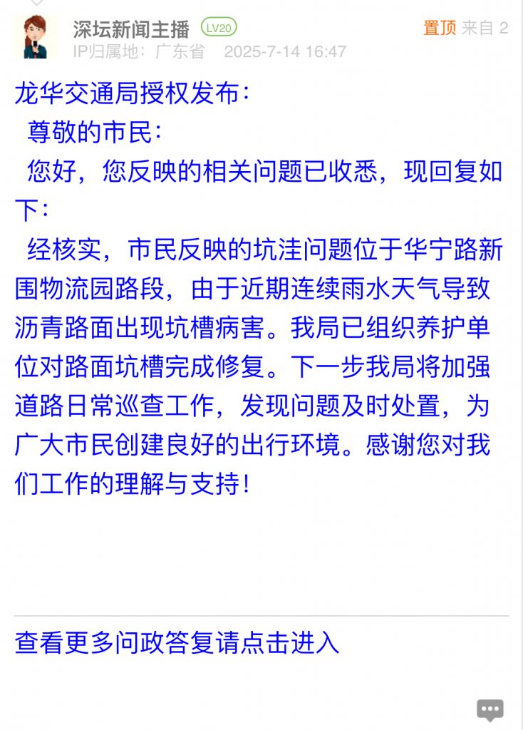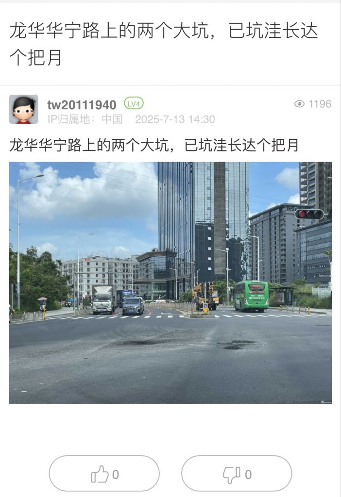 28. 帖文《龍華華寧路上的兩個大坑,已坑洼長達個把月》