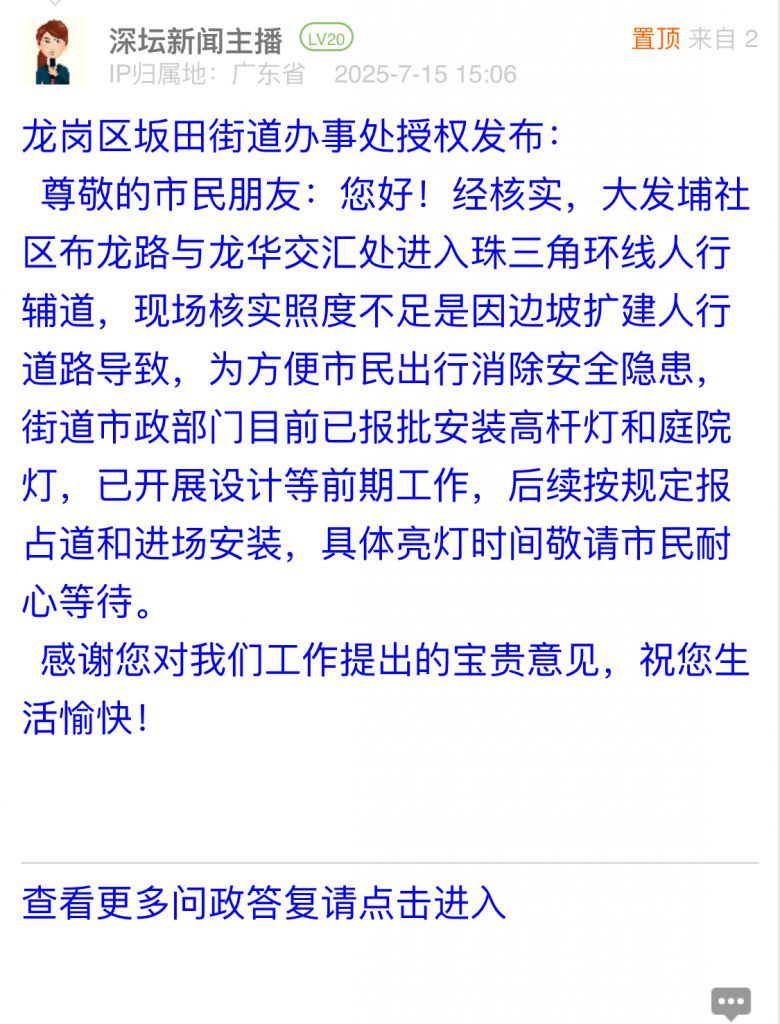 尊敬的市民朋友:您好!經(jīng)核實,大發(fā)埔社區(qū)布龍路與龍華交匯處進入珠三角環(huán)線人行輔道,現(xiàn)場核實照度不足是因邊坡擴建人行道路導(dǎo)致,為方便市民出行消除安全隱患,街道市政部門目前已報批安裝高桿燈和庭院燈,已開展設(shè)計等前期工作,后續(xù)按規(guī)定報占道和進場安裝,具體亮燈時間敬請市民耐心等待。
