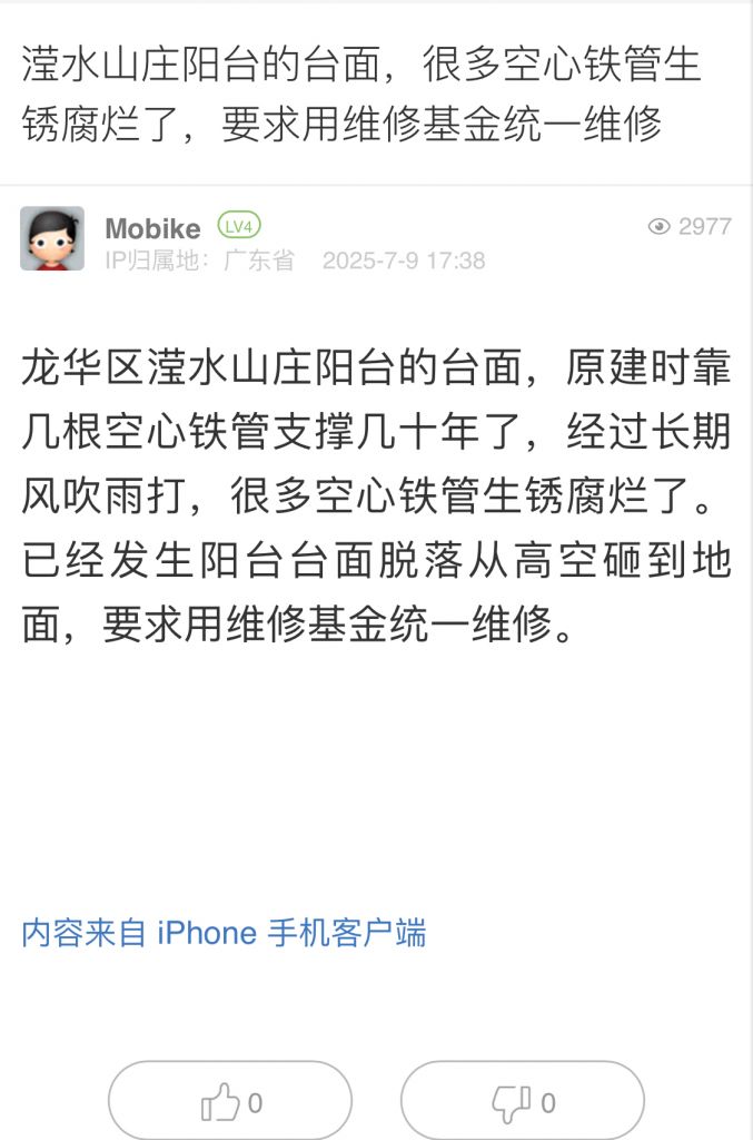 15. 帖文《瀅水山莊陽臺的臺面,很多空心鐵管生銹腐爛了,要求用維修基金統(tǒng)一維修》