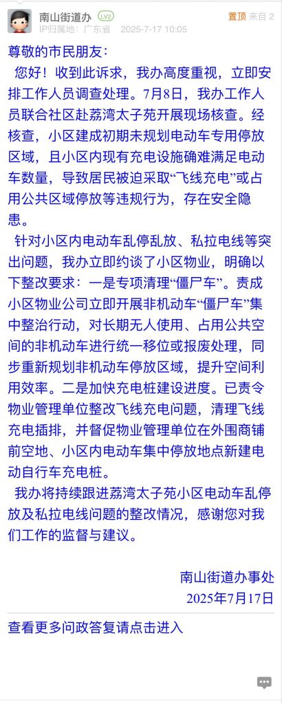 我辦將持續(xù)跟進荔灣太子苑小區(qū)電動車亂停放及私拉電線問題的整改情況,感謝您對我們工作的監(jiān)督與建議。
