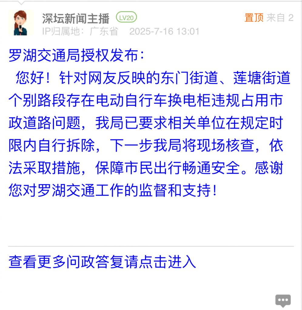 您好!針對網(wǎng)友反映的東門街道、蓮塘街道個別路段存在電動自行車換電柜違規(guī)占用市政道路問題,我局已要求相關(guān)單位在規(guī)定時限內(nèi)自行拆除,下一步我局將現(xiàn)場核查,依法采取措施,保障市民出行暢通安全。感謝您對羅湖交通工作的監(jiān)督和支持!