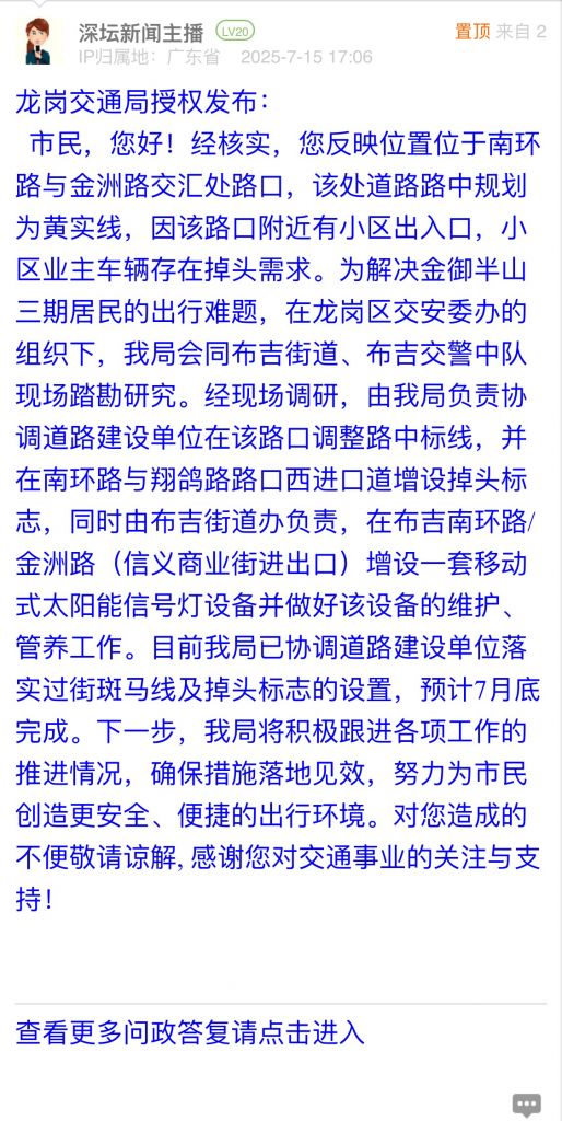 市民,您好!經(jīng)核實,您反映位置位于南環(huán)路與金洲路交匯處路口,該處道路路中規(guī)劃為黃實線,因該路口附近有小區(qū)出入口,小區(qū)業(yè)主車輛存在掉頭需求。為解決金御半山三期居民的出行難題,在龍崗區(qū)交安委辦的組織下,我局會同布吉街道、布吉交警中隊現(xiàn)場踏勘研究。經(jīng)現(xiàn)場調(diào)研,由我局負責(zé)協(xié)調(diào)道路建設(shè)單位在該路口調(diào)整路中標線,并在南環(huán)路與翔鴿路路口西進口道增設(shè)掉頭標志,同時由布吉街道辦負責(zé),在布吉南環(huán)路/金洲路(信義商業(yè)街進出口)增設(shè)一套移動式太陽能信號燈設(shè)備并做好該設(shè)備的維護、管養(yǎng)工作。目前我局已協(xié)調(diào)道路建設(shè)單位落實過街斑馬線及掉頭標志的設(shè)置,預(yù)計7月底完成。下一步,我局將積極跟進各項工作的推進情況,確保措施落地見效,努力為市民創(chuàng)造更安全、便捷的出行環(huán)境。對您造成的不便敬請諒解, 感謝您對交通事業(yè)的關(guān)注與支持!