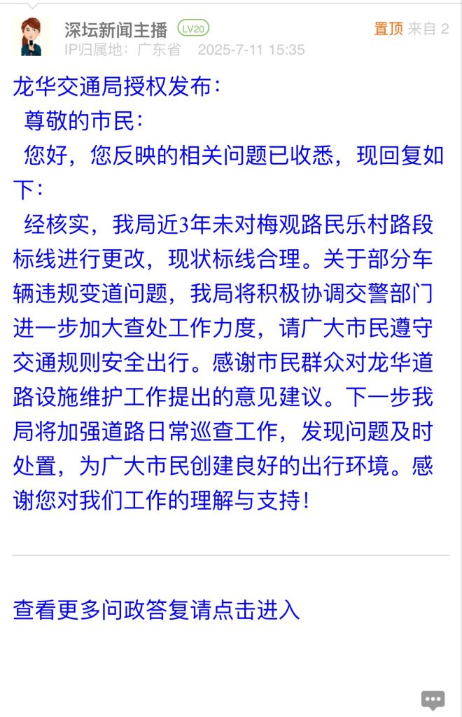 經(jīng)核實,我局近3年未對梅觀路民樂村路段標線進行更改,現(xiàn)狀標線合理。關(guān)于部分車輛違規(guī)變道問題,我局將積極協(xié)調(diào)交警部門進一步加大查處工作力度,請廣大市民遵守交通規(guī)則安全出行。感謝市民群眾對龍華道路設(shè)施維護工作提出的意見建議。下一步我局將加強道路日常巡查工作,發(fā)現(xiàn)問題及時處置,為廣大市民創(chuàng)建良好的出行環(huán)境。感謝您對我們工作的理解與支持!