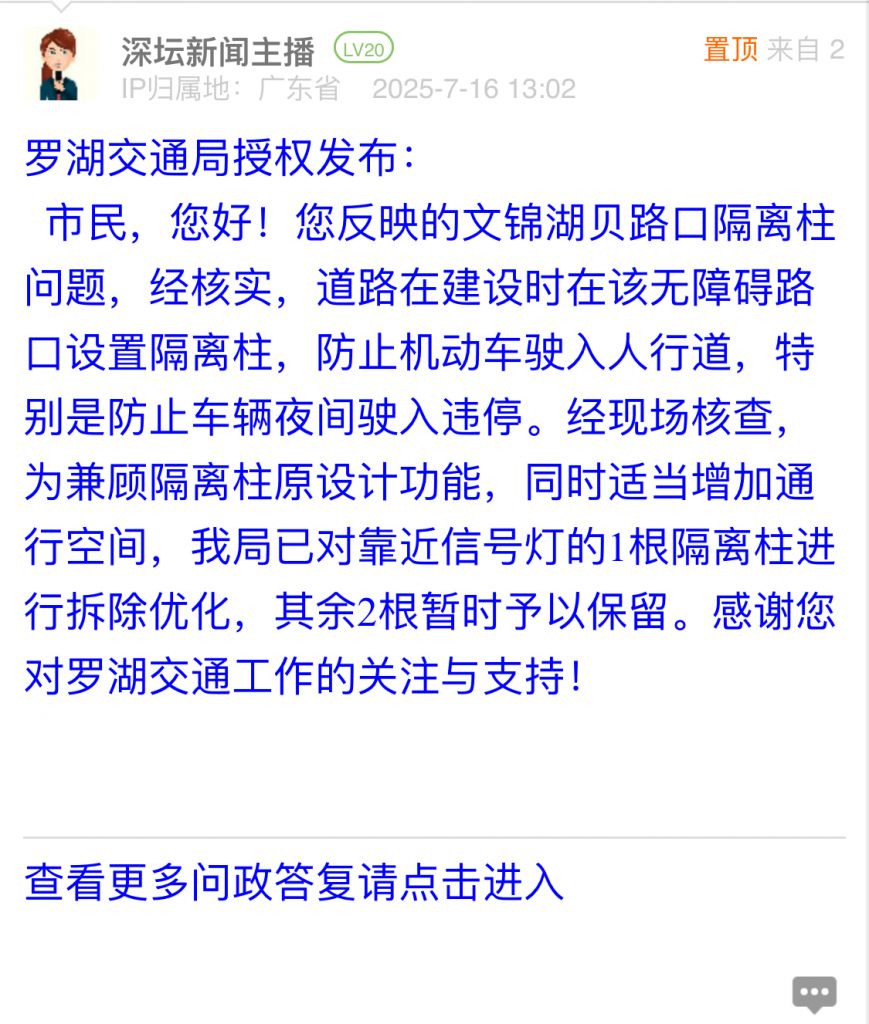 2. 帖文《羅湖文錦湖貝路口斑馬線隔離柱宜盡快拆除》