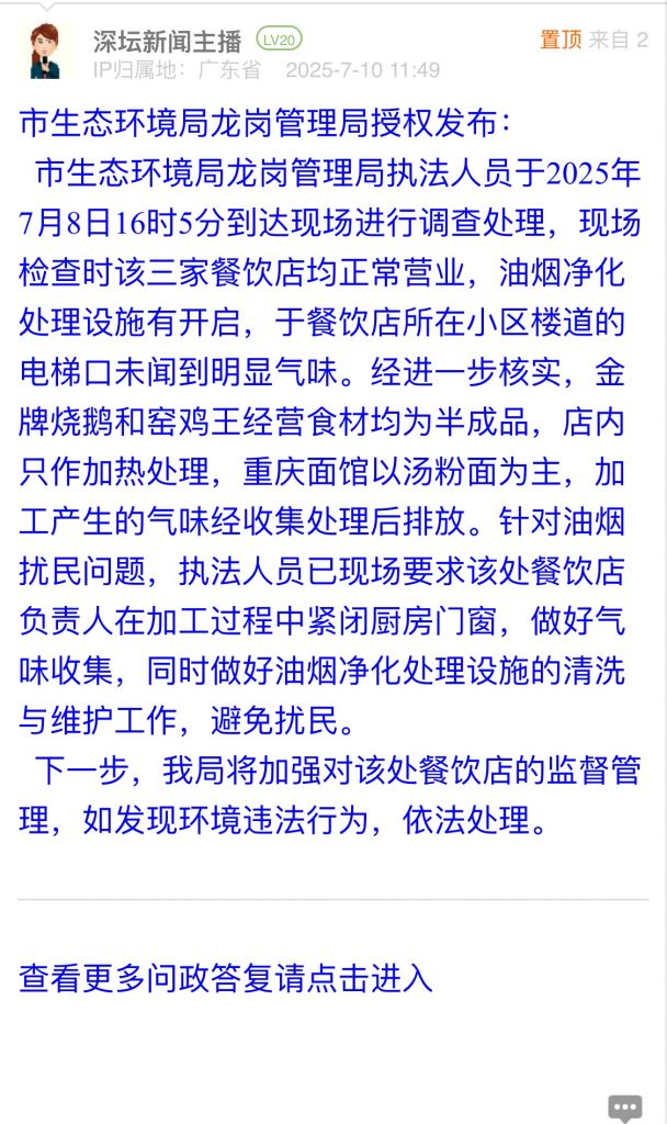 市生態(tài)環(huán)境局龍崗管理局執(zhí)法人員于2025年7月8日16時5分到達現(xiàn)場進行調(diào)查處理,現(xiàn)場檢查時該三家餐飲店均正常營業(yè),油煙凈化處理設(shè)施有開啟,于餐飲店所在小區(qū)樓道的電梯口未聞到明顯氣味。經(jīng)進一步核實,金牌燒鵝和窯雞王經(jīng)營食材均為半成品,店內(nèi)只作加熱處理,重慶面館以湯粉面為主,加工產(chǎn)生的氣味經(jīng)收集處理后排放。針對油煙擾民問題,執(zhí)法人員已現(xiàn)場要求該處餐飲店負責(zé)人在加工過程中緊閉廚房門窗,做好氣味收集,同時做好油煙凈化處理設(shè)施的清洗與維護工作,避免擾民。