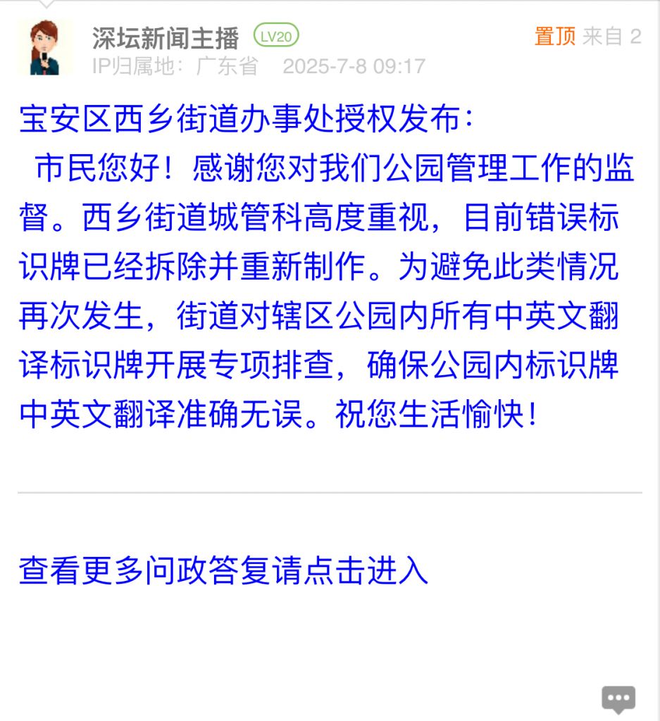 市民您好!感謝您對我們公園管理工作的監(jiān)督。西鄉(xiāng)街道城管科高度重視,目前錯誤標識牌已經(jīng)拆除并重新制作。為避免此類情況再次發(fā)生,街道對轄區(qū)公園內(nèi)所有中英文翻譯標識牌開展專項排查,確保公園內(nèi)標識牌中英文翻譯準確無誤。祝您生活愉快!