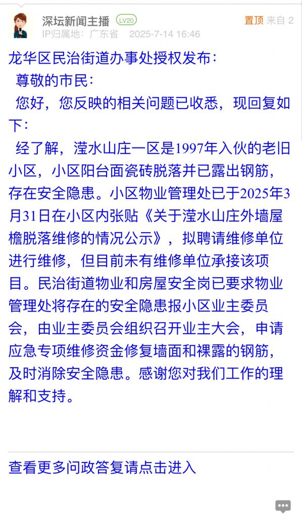 經(jīng)了解,瀅水山莊一區(qū)是1997年入伙的老舊小區(qū),小區(qū)陽臺面瓷磚脫落并已露出鋼筋,存在安全隱患。小區(qū)物業(yè)管理處已于2025年3月31日在小區(qū)內(nèi)張貼《關(guān)于瀅水山莊外墻屋檐脫落維修的情況公示》,擬聘請維修單位進行維修,但目前未有維修單位承接該項目。民治街道物業(yè)和房屋安全崗已要求物業(yè)管理處將存在的安全隱患報小區(qū)業(yè)主委員會,由業(yè)主委員會組織召開業(yè)主大會,申請應(yīng)急專項維修資金修復(fù)墻面和裸露的鋼筋,及時消除安全隱患。感謝您對我們工作的理解和支持。
