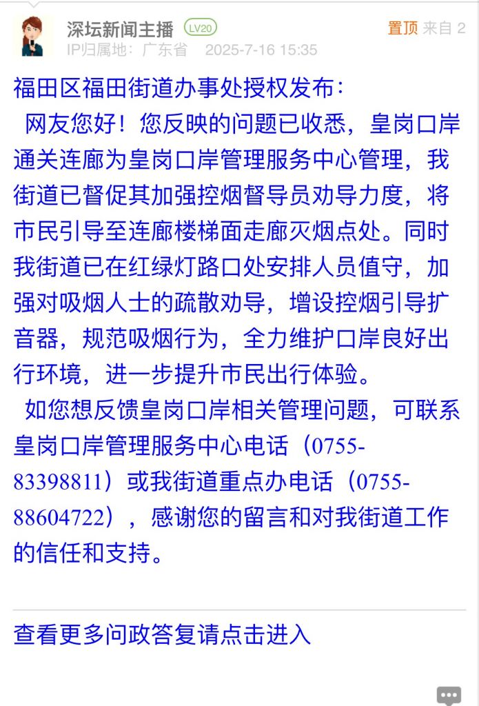 網(wǎng)友您好!您反映的問題已收悉,皇崗口岸通關(guān)連廊為皇崗口岸管理服務(wù)中心管理,我街道已督促其加強控?zé)煻綄?dǎo)員勸導(dǎo)力度,將市民引導(dǎo)至連廊樓梯面走廊滅煙點處。同時我街道已在紅綠燈路口處安排人員值守,加強對吸煙人士的疏散勸導(dǎo),增設(shè)控?zé)熞龑?dǎo)擴音器,規(guī)范吸煙行為,全力維護口岸良好出行環(huán)境,進一步提升市民出行體驗。