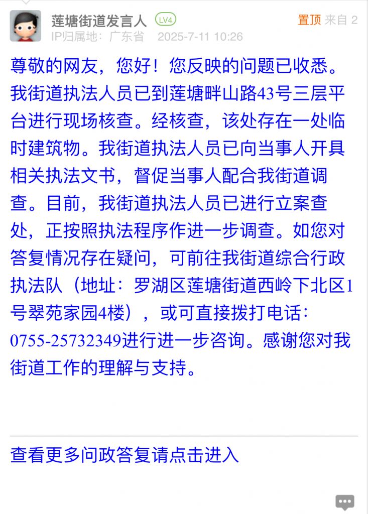 尊敬的網(wǎng)友,您好!您反映的問題已收悉。我街道執(zhí)法人員已到蓮塘畔山路43號三層平臺進行現(xiàn)場核查。經(jīng)核查,該處存在一處臨時建筑物。我街道執(zhí)法人員已向當(dāng)事人開具相關(guān)執(zhí)法文書,督促當(dāng)事人配合我街道調(diào)查。目前,我街道執(zhí)法人員已進行立案查處,正按照執(zhí)法程序作進一步調(diào)查。如您對答復(fù)情況存在疑問,可前往我街道綜合行政執(zhí)法隊(地址:羅湖區(qū)蓮塘街道西嶺下北區(qū)1號翠苑家園4樓),或可直接撥打電話:0755-25732349進行進一步咨詢。感謝您對我街道工作的理解與支持。