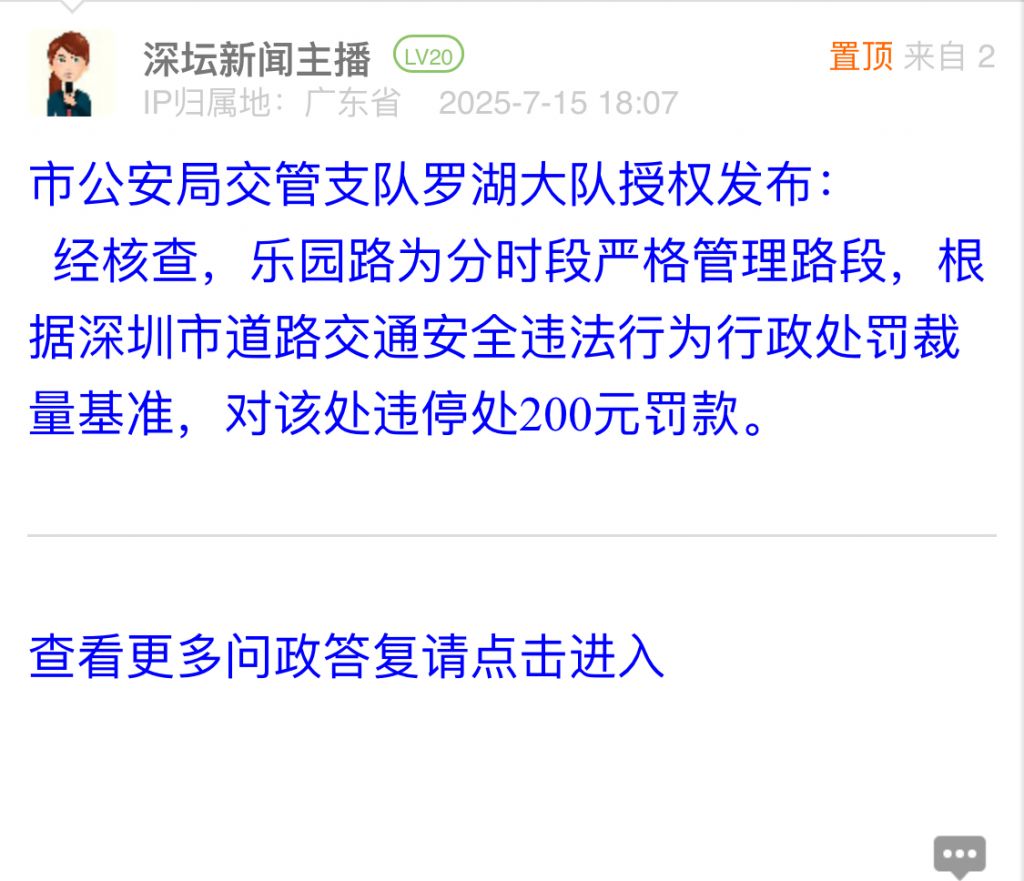 經(jīng)核查,樂園路為分時段嚴格管理路段,根據(jù)深圳市道路交通安全違法行為行政處罰裁量基準,對該處違停處200元罰款。