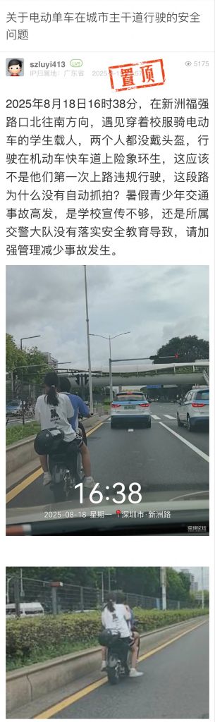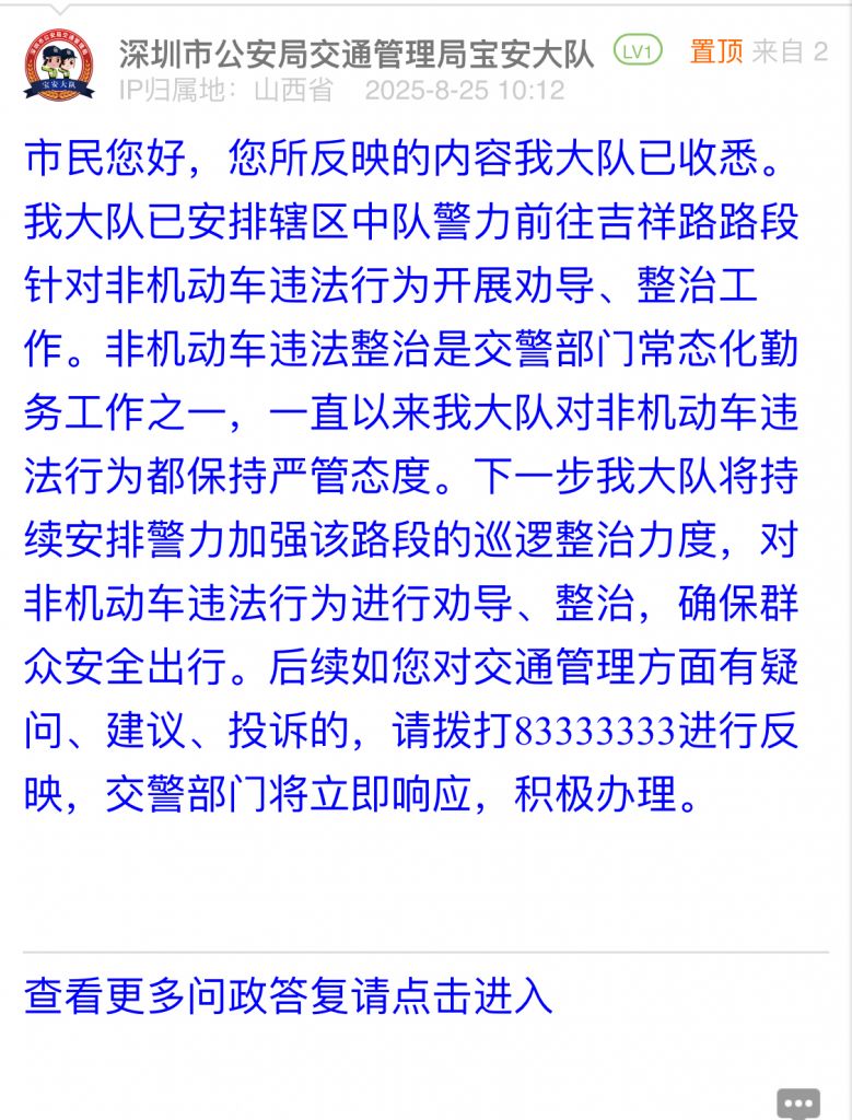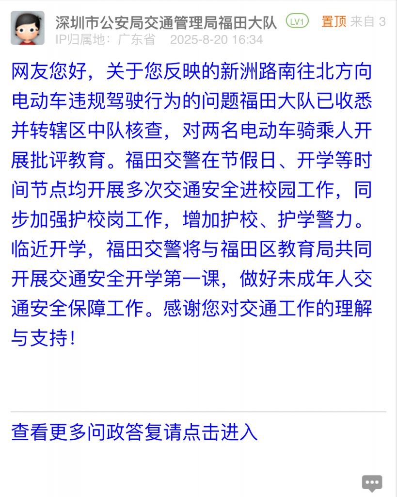 網(wǎng)友您好,關(guān)于您反映的新洲路南往北方向電動車違規(guī)駕駛行為的問題福田大隊已收悉并轉(zhuǎn)轄區(qū)中隊核查,對兩名電動車騎乘人開展批評教育。福田交警在節(jié)假日、開學(xué)等時間節(jié)點均開展多次交通安全進(jìn)校園工作,同步加強護(hù)校崗工作,增加護(hù)校、護(hù)學(xué)警力。臨近開學(xué),福田交警將與福田區(qū)教育局共同開展交通安全開學(xué)第一課,做好未成年人交通安全保障工作。感謝您對交通工作的理解與支持!