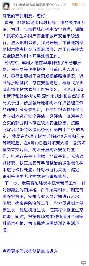經(jīng)核實,濱河大道在早年種植了部分非洲楝、白千層等速生樹種,目前已步入衰老期,容易出現(xiàn)樹干空洞或根部腐爛情況,遇風(fēng)易折斷倒伏,存在安全隱患。根據(jù)《深圳城市綠化樹木修剪工作指引》、《深圳市城市管理和綜合執(zhí)法局 深圳市規(guī)劃和自然資源局關(guān)于進(jìn)一步加強綠地和樹木保護(hù)管理工作的通知》等有關(guān)規(guī)定,我局組織園林綠化專家對樹木進(jìn)行安全評估,經(jīng)評估,濱河皇崗立交的部分樹木存在較大安全隱患,按照《深圳經(jīng)濟特區(qū)綠化條例》第四十二條 的規(guī)定, 我局在辦理了樹木遷移砍伐許可和公示等流程后,在8月10日后對濱河大道(含濱河皇崗立交片區(qū))樹木開展樹木安全處置工作,針對存在主干空腐、嚴(yán)重歪斜,無法通過修剪、扶正加固等手段整治的速生老化樹木進(jìn)行砍伐處置;針對根冠比失衡、偏冠、歪斜等速生老化樹木進(jìn)行重度修剪。