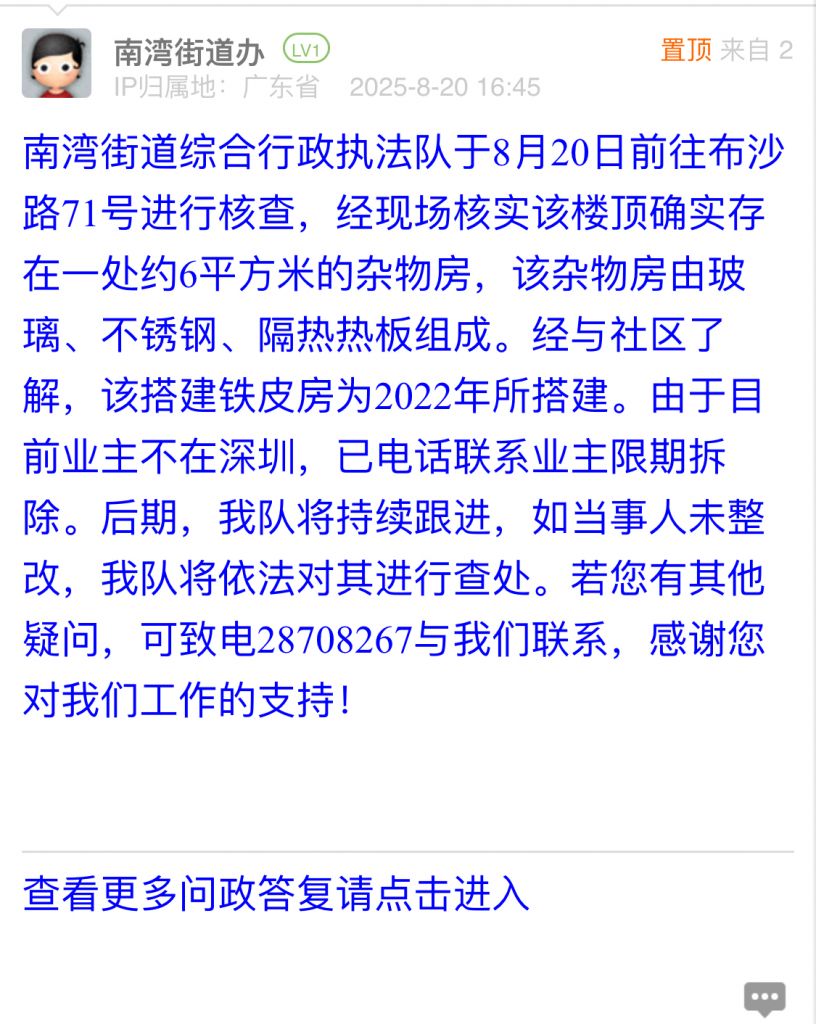 南灣街道綜合行政執(zhí)法隊于8月20日前往布沙路71號進(jìn)行核查,經(jīng)現(xiàn)場核實該樓頂確實存在一處約6平方米的雜物房,該雜物房由玻璃、不銹鋼、隔熱熱板組成。經(jīng)與社區(qū)了解,該搭建鐵皮房為2022年所搭建。由于目前業(yè)主不在深圳,已電話聯(lián)系業(yè)主限期拆除。后期,我隊將持續(xù)跟進(jìn),如當(dāng)事人未整改,我隊將依法對其進(jìn)行查處。若您有其他疑問,可致電28708267與我們聯(lián)系,感謝您對我們工作的支持!