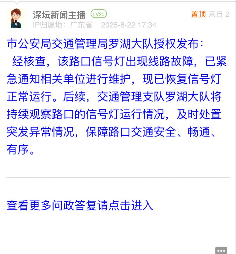 經(jīng)核查,該路口信號燈出現(xiàn)線路故障,已緊急通知相關(guān)單位進(jìn)行維護(hù),現(xiàn)已恢復(fù)信號燈正常運行。后續(xù),交通管理支隊羅湖大隊將持續(xù)觀察路口的信號燈運行情況,及時處置突發(fā)異常情況,保障路口交通安全、暢通、有序。