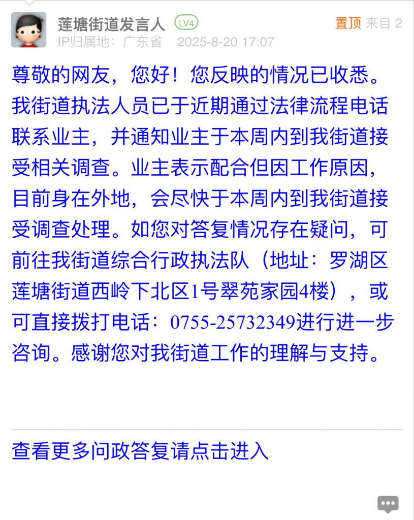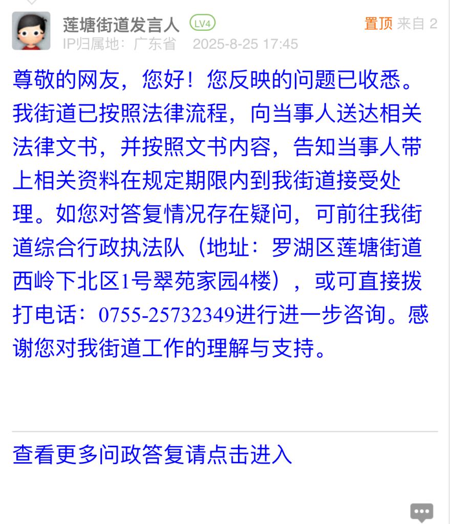 尊敬的網(wǎng)友,您好!您反映的問題已收悉。我街道已按照法律流程,向當(dāng)事人送達(dá)相關(guān)法律文書,并按照文書內(nèi)容,告知當(dāng)事人帶上相關(guān)資料在規(guī)定期限內(nèi)到我街道接受處理。如您對答復(fù)情況存在疑問,可前往我街道綜合行政執(zhí)法隊(地址:羅湖區(qū)蓮塘街道西嶺下北區(qū)1號翠苑家園4樓),或可直接撥打電話:0755-25732349進(jìn)行進(jìn)一步咨詢。感謝您對我街道工作的理解與支持。