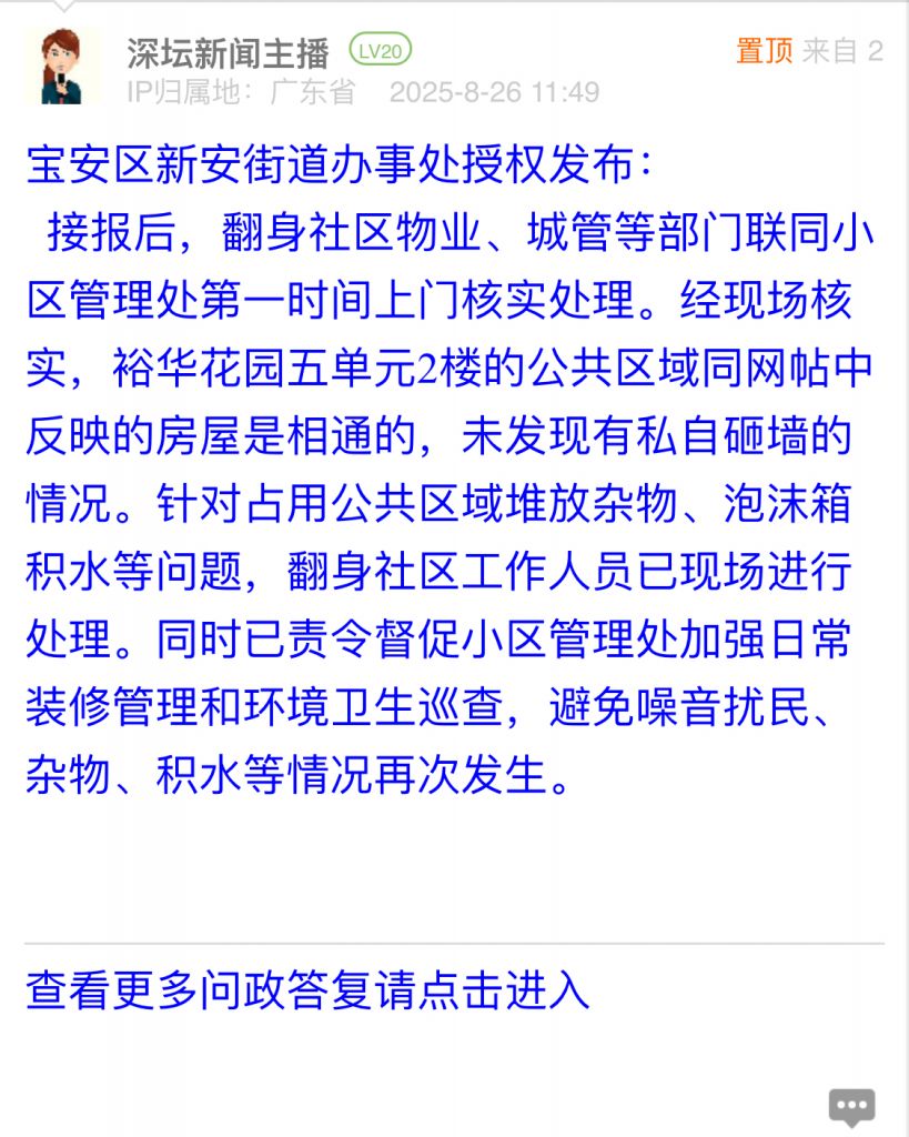 接報后,翻身社區(qū)物業(yè)、城管等部門聯(lián)同小區(qū)管理處第一時間上門核實處理。經(jīng)現(xiàn)場核實,裕華花園五單元2樓的公共區(qū)域同網(wǎng)帖中反映的房屋是相通的,未發(fā)現(xiàn)有私自砸墻的情況。針對占用公共區(qū)域堆放雜物、泡沫箱積水等問題,翻身社區(qū)工作人員已現(xiàn)場進(jìn)行處理。同時已責(zé)令督促小區(qū)管理處加強日常裝修管理和環(huán)境衛(wèi)生巡查,避免噪音擾民、雜物、積水等情況再次發(fā)生。