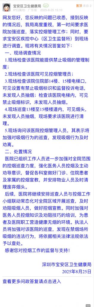 網(wǎng)友您好,您反映的問題已收悉,接到反映的情況后,我局高度重視,第一時間要求醫(yī)院加強巡查,落實控?zé)煿芾砉ぷ鳎煌瑫r,要求寶安區(qū)疾控中心(區(qū)衛(wèi)生監(jiān)督所)到現(xiàn)場進(jìn)行調(diào)查?,F(xiàn)將有關(guān)情況答復(fù)如下: