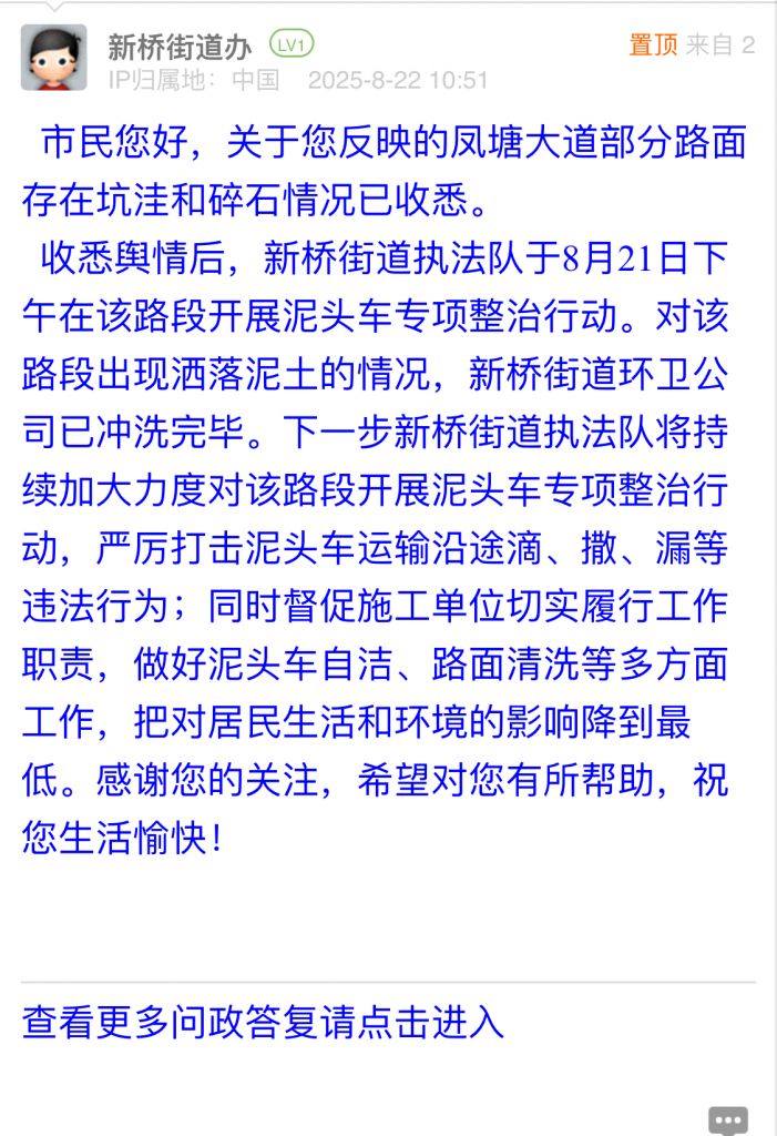 收悉輿情后,新橋街道執(zhí)法隊于8月21日下午在該路段開展泥頭車專項整治行動。對該路段出現(xiàn)灑落泥土的情況,新橋街道環(huán)衛(wèi)公司已沖洗完畢。下一步新橋街道執(zhí)法隊將持續(xù)加大力度對該路段開展泥頭車專項整治行動,嚴(yán)厲打擊泥頭車運輸沿途滴、撒、漏等違法行為;同時督促施工單位切實履行工作職責(zé),做好泥頭車自潔、路面清洗等多方面工作,把對居民生活和環(huán)境的影響降到最低。感謝您的關(guān)注,希望對您有所幫助,祝您生活愉快!