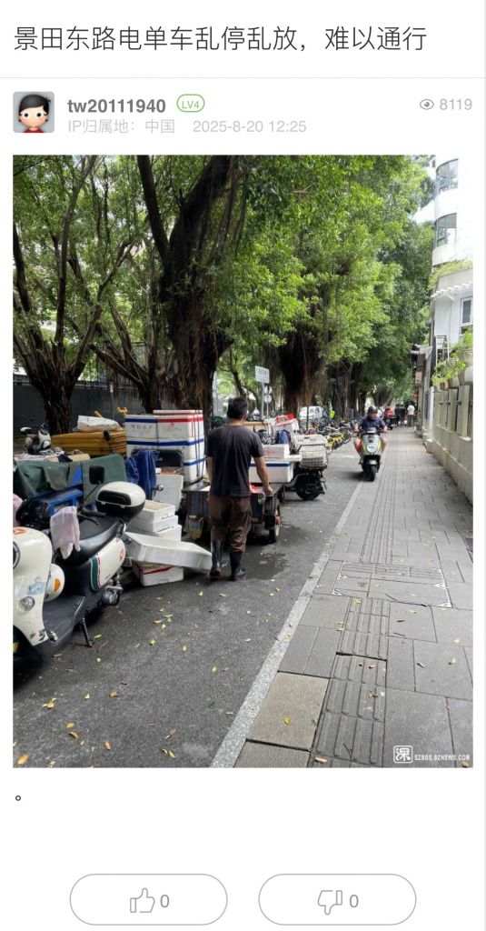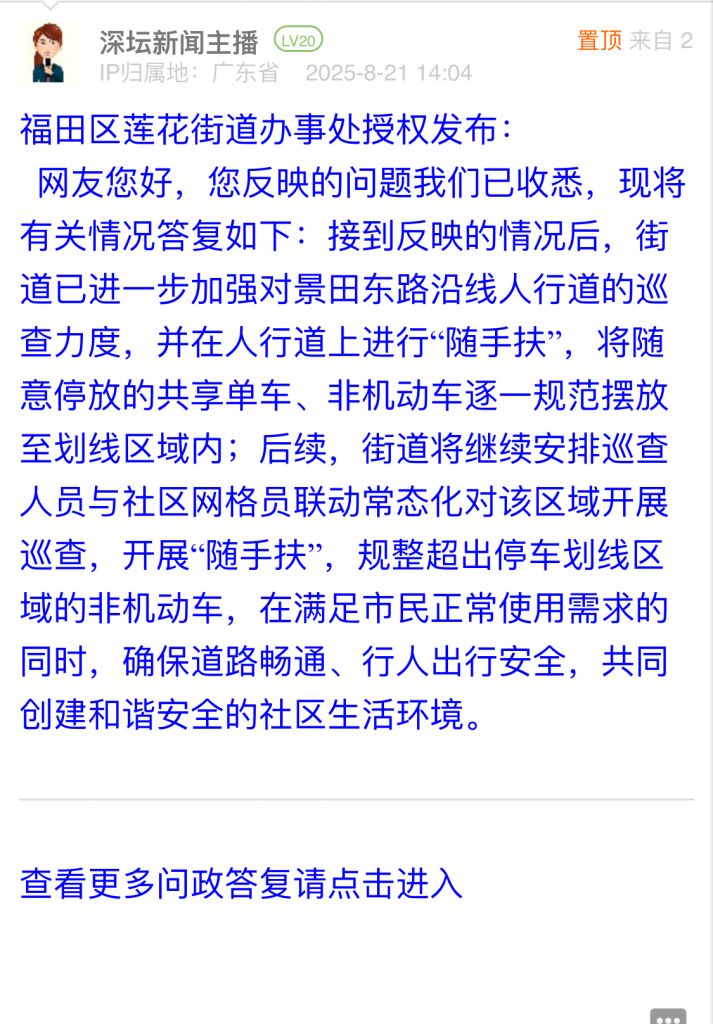 網(wǎng)友您好,您反映的問題我們已收悉,現(xiàn)將有關(guān)情況答復(fù)如下:接到反映的情況后,街道已進(jìn)一步加強對景田東路沿線人行道的巡查力度,并在人行道上進(jìn)行“隨手扶”,將隨意停放的共享單車、非機動車逐一規(guī)范擺放至劃線區(qū)域內(nèi);后續(xù),街道將繼續(xù)安排巡查人員與社區(qū)網(wǎng)格員聯(lián)動常態(tài)化對該區(qū)域開展巡查,開展“隨手扶”,規(guī)整超出停車劃線區(qū)域的非機動車,在滿足市民正常使用需求的同時,確保道路暢通、行人出行安全,共同創(chuàng)建和諧安全的社區(qū)生活環(huán)境。