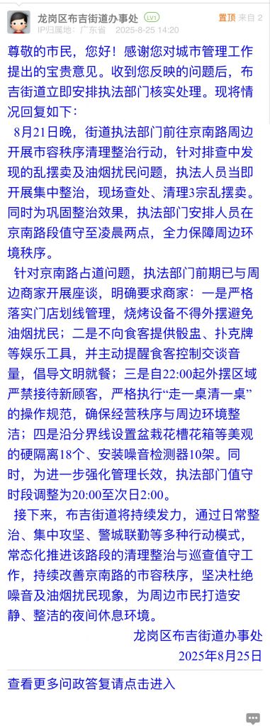 接下來,布吉街道將持續(xù)發(fā)力,通過日常整治、集中攻堅、警城聯(lián)勤等多種行動模式,常態(tài)化推進(jìn)該路段的清理整治與巡查值守工作,持續(xù)改善京南路的市容秩序,堅決杜絕噪音及油煙擾民現(xiàn)象,為周邊市民打造安靜、整潔的夜間休息環(huán)境。