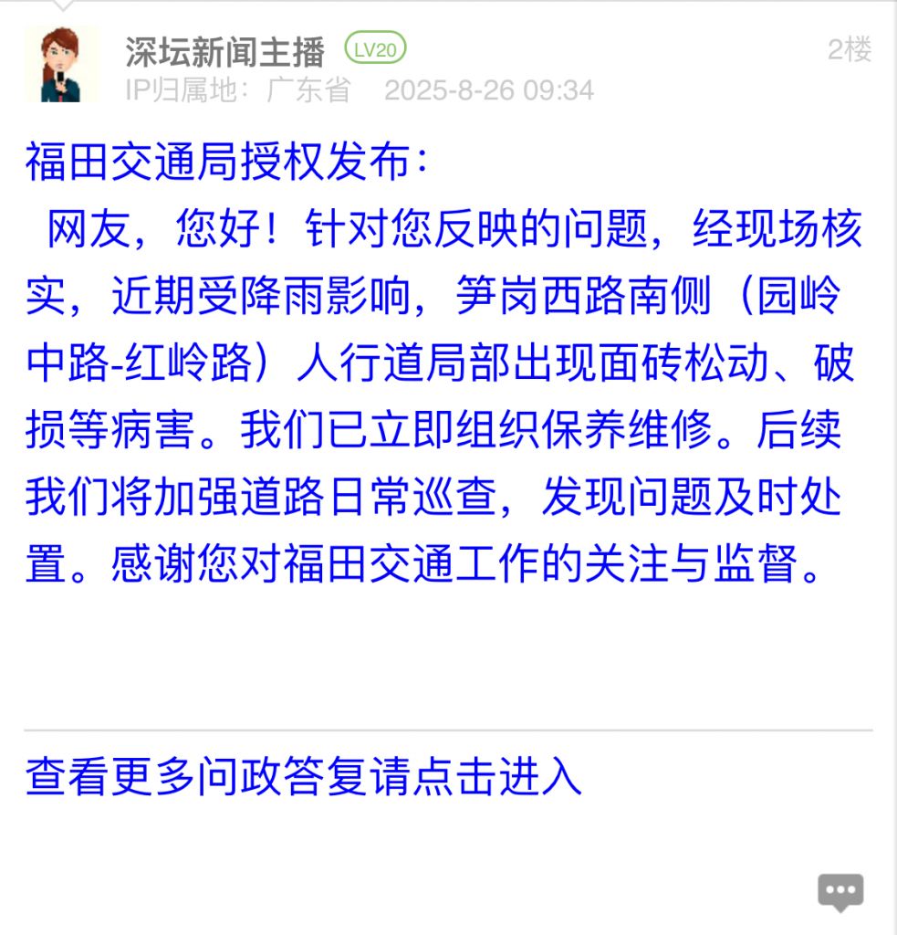 網(wǎng)友,您好!針對您反映的問題,經(jīng)現(xiàn)場核實,近期受降雨影響,筍崗西路南側(cè)(園嶺中路-紅嶺路)人行道局部出現(xiàn)面磚松動、破損等病害。我們已立即組織保養(yǎng)維修。后續(xù)我們將加強道路日常巡查,發(fā)現(xiàn)問題及時處置。感謝您對福田交通工作的關(guān)注與監(jiān)督。