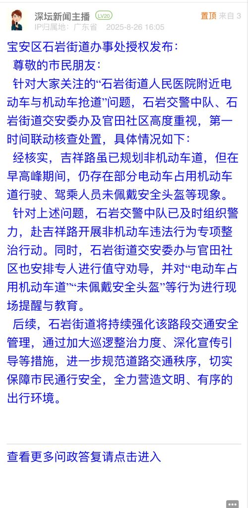 38. 帖文《寶安石巖街道人民醫(yī)院附近有非機動車道大量電雞與機動車車搶道》