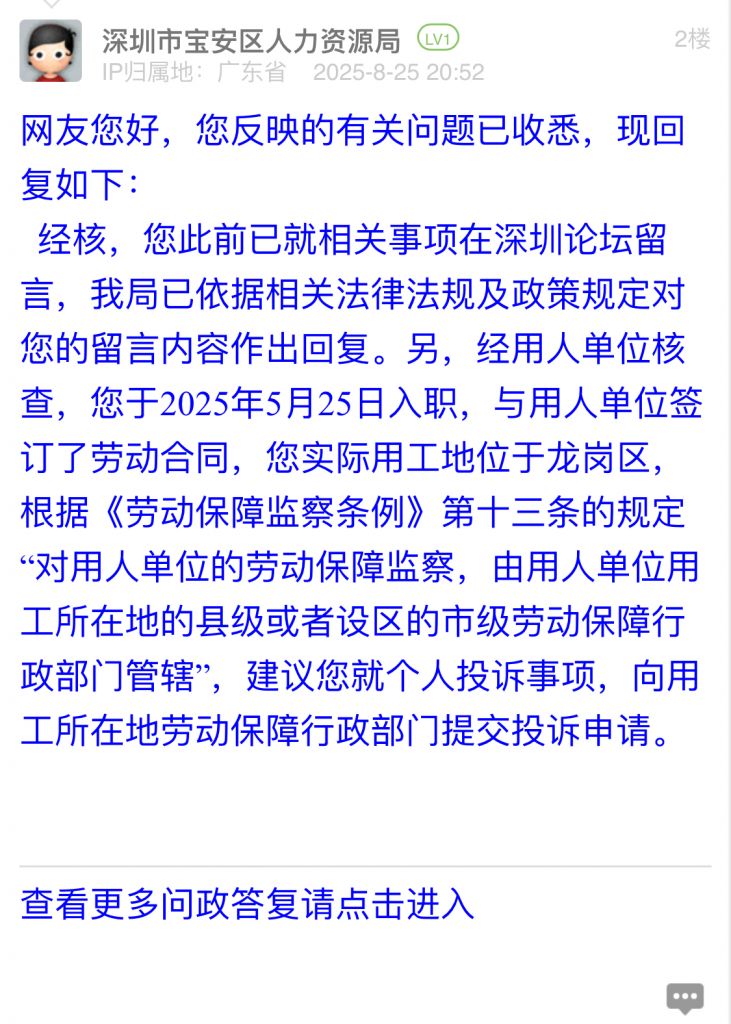 經(jīng)核,您此前已就相關(guān)事項在深圳論壇留言,我局已依據(jù)相關(guān)法律法規(guī)及政策規(guī)定對您的留言內(nèi)容作出回復(fù)。另,經(jīng)用人單位核查,您于2025年5月25日入職,與用人單位簽訂了勞動合同,您實際用工地位于龍崗區(qū),根據(jù)《勞動保障監(jiān)察條例》第十三條的規(guī)定“對用人單位的勞動保障監(jiān)察,由用人單位用工所在地的縣級或者設(shè)區(qū)的市級勞動保障行政部門管轄”,建議您就個人投訴事項,向用工所在地勞動保障行政部門提交投訴申請。