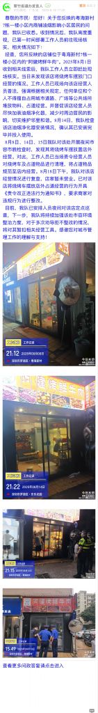 目前,我隊已安排人員夜間對該店定點巡查,下一步,我隊將持續(xù)加強該處市容環(huán)境整治力度,對于多次勸導(dǎo)拒不整改的情況,將對其暫扣相關(guān)經(jīng)營工具。感謝您對城市管理工作的理解與支持!