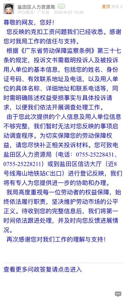 由于您此次提供的個人信息及用人單位信息不夠完整,我們暫時無法對您反映的事項啟動調(diào)查程序。為切實保障您的勞動保障權(quán)益,請您盡快補正相關(guān)投訴材料。您可致電鹽田區(qū)人力資源局(電話:0755-25228431、0755-25228211)或到鹽田區(qū)信訪大廳(近8號線海山地鐵站C出口)進(jìn)行登記反映,我們將有專人為您提供進(jìn)一步的協(xié)助和辦理。