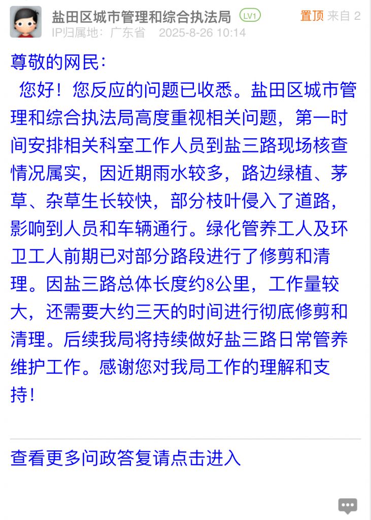 您好!您反應(yīng)的問題已收悉。鹽田區(qū)城市管理和綜合執(zhí)法局高度重視相關(guān)問題,第一時間安排相關(guān)科室工作人員到鹽三路現(xiàn)場核查情況屬實,因近期雨水較多,路邊綠植、茅草、雜草生長較快,部分枝葉侵入了道路,影響到人員和車輛通行。綠化管養(yǎng)工人及環(huán)衛(wèi)工人前期已對部分路段進(jìn)行了修剪和清理。因鹽三路總體長度約8公里,工作量較大,還需要大約三天的時間進(jìn)行徹底修剪和清理。后續(xù)我局將持續(xù)做好鹽三路日常管養(yǎng)維護(hù)工作。感謝您對我局工作的理解和支持!