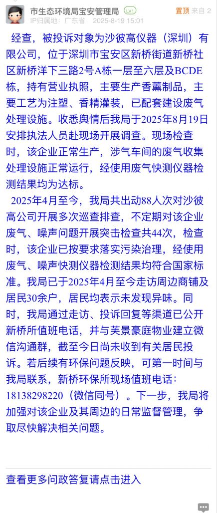 經(jīng)查,被投訴對象為沙彼高儀器(深圳)有限公司,位于深圳市寶安區(qū)新橋街道新橋社區(qū)新橋洋下三路2號A棟一層至六層及BCDE棟,持有營業(yè)執(zhí)照,主要生產(chǎn)香薰制品,主要工藝為注塑、香精灌裝,已配套建設(shè)廢氣處理設(shè)施。收悉輿情后我局于2025年8月19日安排執(zhí)法人員赴現(xiàn)場開展調(diào)查?,F(xiàn)場檢查時,該企業(yè)正常生產(chǎn),涉氣車間的廢氣收集處理設(shè)施正常運行,經(jīng)使用廢氣快測儀器檢測結(jié)果均為達(dá)標(biāo)。