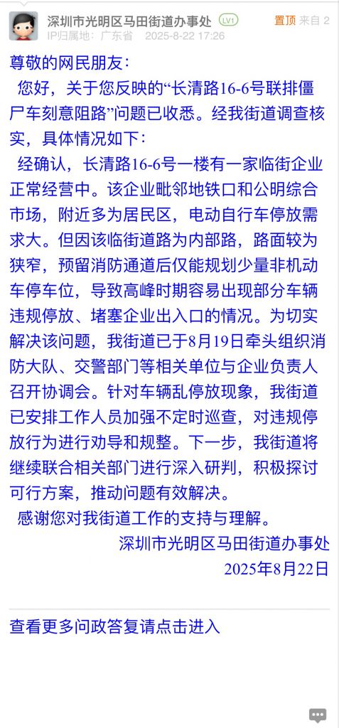 經(jīng)確認(rèn),長清路16-6號一樓有一家臨街企業(yè)正常經(jīng)營中。該企業(yè)毗鄰地鐵口和公明綜合市場,附近多為居民區(qū),電動自行車停放需求大。但因該臨街道路為內(nèi)部路,路面較為狹窄,預(yù)留消防通道后僅能規(guī)劃少量非機動車停車位,導(dǎo)致高峰時期容易出現(xiàn)部分車輛違規(guī)停放、堵塞企業(yè)出入口的情況。為切實解決該問題,我街道已于8月19日牽頭組織消防大隊、交警部門等相關(guān)單位與企業(yè)負(fù)責(zé)人召開協(xié)調(diào)會。針對車輛亂停放現(xiàn)象,我街道已安排工作人員加強不定時巡查,對違規(guī)停放行為進(jìn)行勸導(dǎo)和規(guī)整。下一步,我街道將繼續(xù)聯(lián)合相關(guān)部門進(jìn)行深入研判,積極探討可行方案,推動問題有效解決。