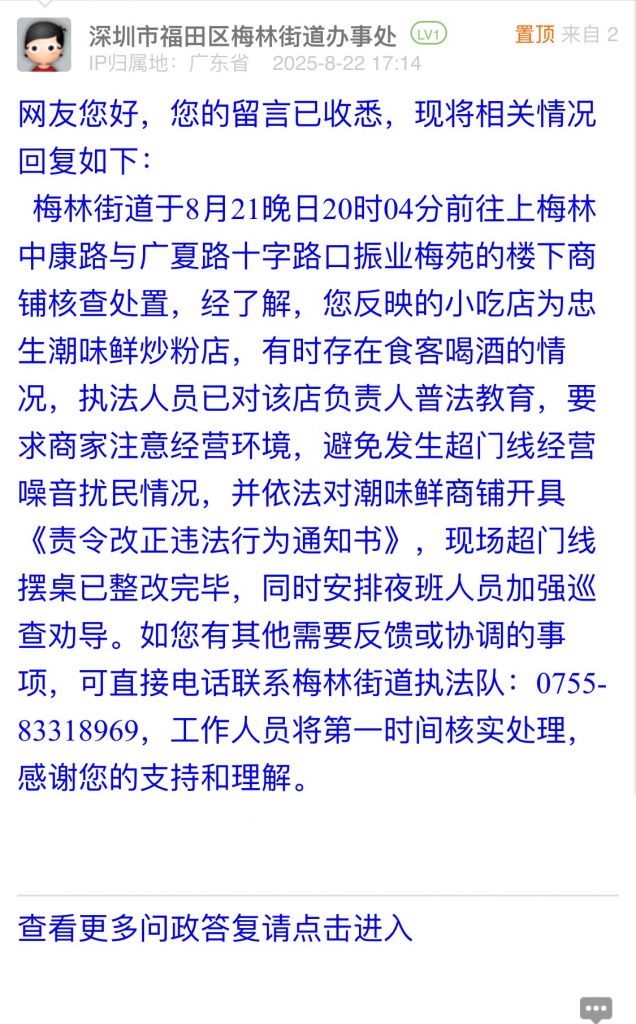 梅林街道于8月21晚日20時04分前往上梅林中康路與廣夏路十字路口振業(yè)梅苑的樓下商鋪核查處置,經(jīng)了解,您反映的小吃店為忠生潮味鮮炒粉店,有時存在食客喝酒的情況,執(zhí)法人員已對該店負(fù)責(zé)人普法教育,要求商家注意經(jīng)營環(huán)境,避免發(fā)生超門線經(jīng)營噪音擾民情況,并依法對潮味鮮商鋪開具《責(zé)令改正違法行為通知書》,現(xiàn)場超門線擺桌已整改完畢,同時安排夜班人員加強巡查勸導(dǎo)。如您有其他需要反饋或協(xié)調(diào)的事項,可直接電話聯(lián)系梅林街道執(zhí)法隊:0755-83318969,工作人員將第一時間核實處理,感謝您的支持和理解。