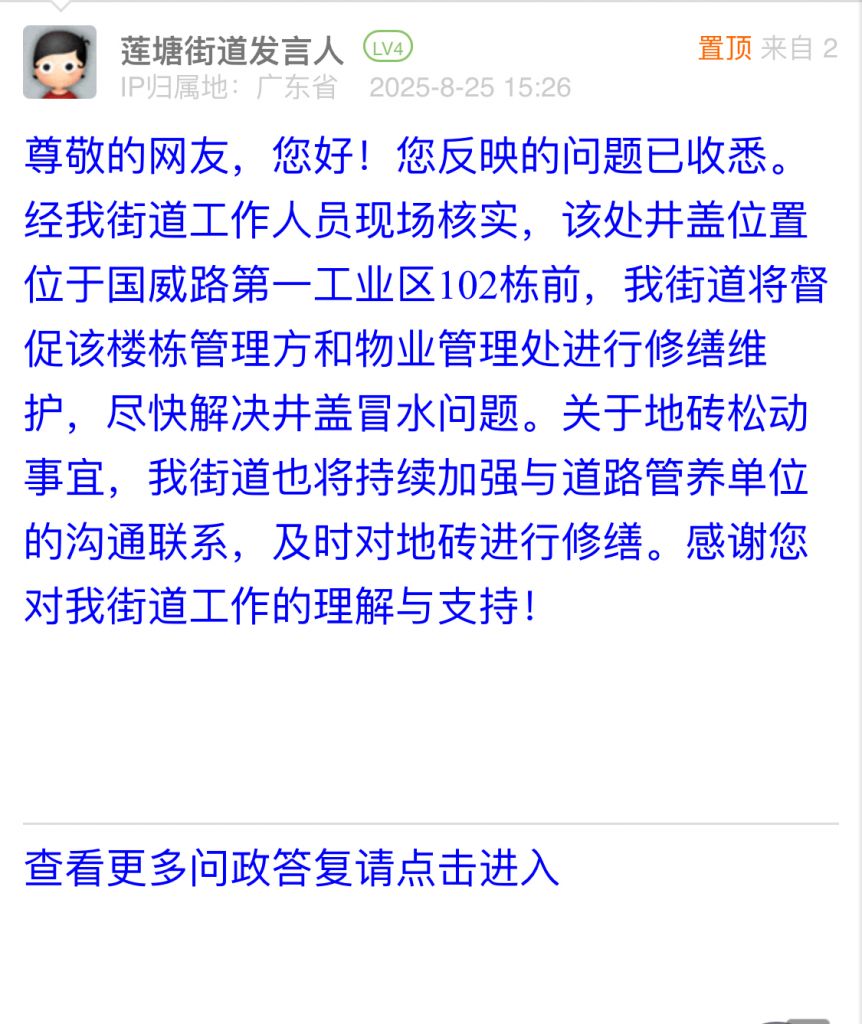尊敬的網(wǎng)友,您好!您反映的問題已收悉。經(jīng)我街道工作人員現(xiàn)場核實,該處井蓋位置位于國威路第一工業(yè)區(qū)102棟前,我街道將督促該樓棟管理方和物業(yè)管理處進(jìn)行修繕維護(hù),盡快解決井蓋冒水問題。關(guān)于地磚松動事宜,我街道也將持續(xù)加強與道路管養(yǎng)單位的溝通聯(lián)系,及時對地磚進(jìn)行修繕。感謝您對我街道工作的理解與支持!