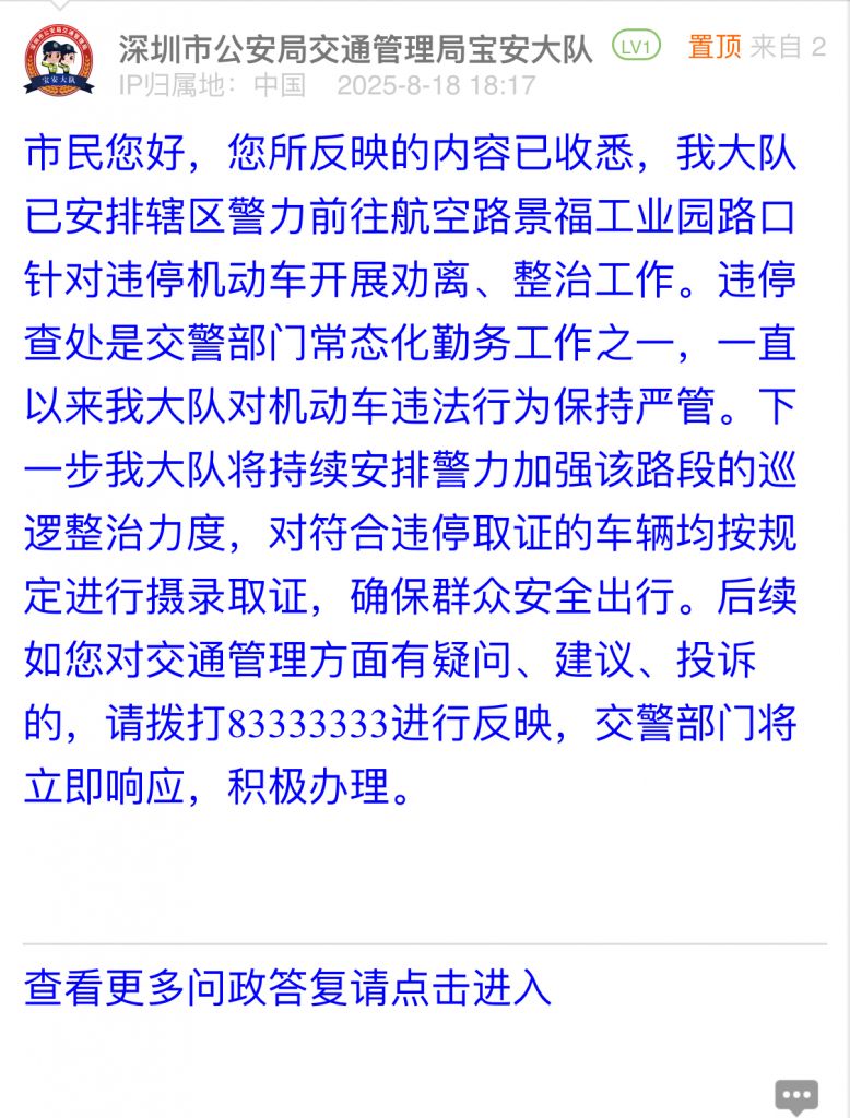 市民您好,您所反映的內(nèi)容已收悉,我大隊已安排轄區(qū)警力前往航空路景福工業(yè)園路口針對違停機動車開展勸離、整治工作。違停查處是交警部門常態(tài)化勤務(wù)工作之一,一直以來我大隊對機動車違法行為保持嚴(yán)管。下一步我大隊將持續(xù)安排警力加強該路段的巡邏整治力度,對符合違停取證的車輛均按規(guī)定進(jìn)行攝錄取證,確保群眾安全出行。后續(xù)如您對交通管理方面有疑問、建議、投訴的,請撥打83333333進(jìn)行反映,交警部門將立即響應(yīng),積極辦理。