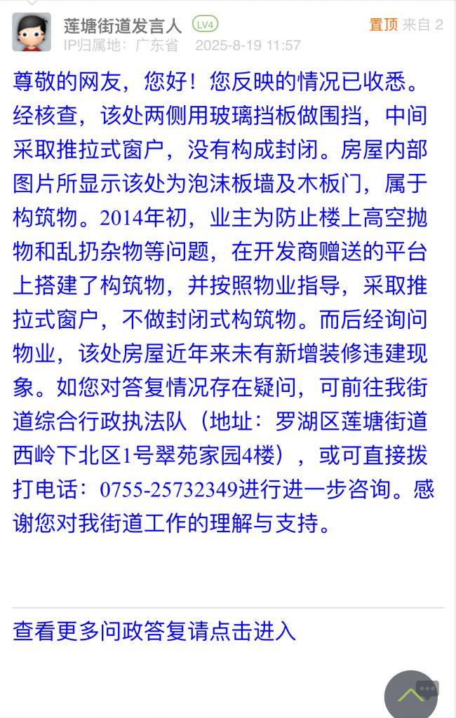 尊敬的網(wǎng)友,您好!您反映的情況已收悉。經(jīng)核查,該處兩側(cè)用玻璃擋板做圍擋,中間采取推拉式窗戶,沒有構(gòu)成封閉。房屋內(nèi)部圖片所顯示該處為泡沫板墻及木板門,屬于構(gòu)筑物。2014年初,業(yè)主為防止樓上高空拋物和亂扔雜物等問題,在開發(fā)商贈送的平臺上搭建了構(gòu)筑物,并按照物業(yè)指導(dǎo),采取推拉式窗戶,不做封閉式構(gòu)筑物。而后經(jīng)詢問物業(yè),該處房屋近年來未有新增裝修違建現(xiàn)象。如您對答復(fù)情況存在疑問,可前往我街道綜合行政執(zhí)法隊(地址:羅湖區(qū)蓮塘街道西嶺下北區(qū)1號翠苑家園4樓),或可直接撥打電話:0755-25732349進(jìn)行進(jìn)一步咨詢。感謝您對我街道工作的理解與支持。