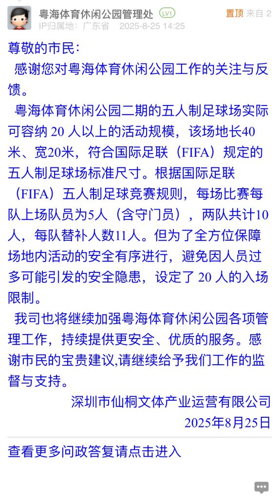 我司也將繼續(xù)加強粵海體育休閑公園各項管理工作,持續(xù)提供更安全、優(yōu)質(zhì)的服務(wù)。感謝市民的寶貴建議,請繼續(xù)給予我們工作的監(jiān)督與支持。