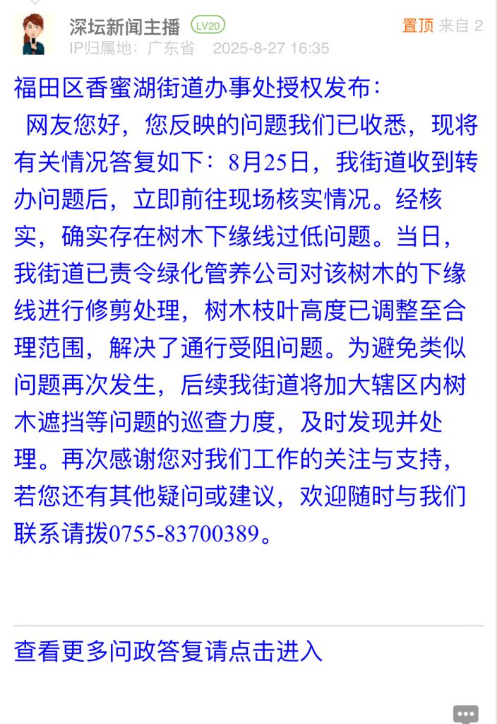網(wǎng)友您好,您反映的問題我們已收悉,現(xiàn)將有關(guān)情況答復(fù)如下:8月25日,我街道收到轉(zhuǎn)辦問題后,立即前往現(xiàn)場核實情況。經(jīng)核實,確實存在樹木下緣線過低問題。當(dāng)日,我街道已責(zé)令綠化管養(yǎng)公司對該樹木的下緣線進(jìn)行修剪處理,樹木枝葉高度已調(diào)整至合理范圍,解決了通行受阻問題。為避免類似問題再次發(fā)生,后續(xù)我街道將加大轄區(qū)內(nèi)樹木遮擋等問題的巡查力度,及時發(fā)現(xiàn)并處理。再次感謝您對我們工作的關(guān)注與支持,若您還有其他疑問或建議,歡迎隨時與我們聯(lián)系請撥0755-83700389。
