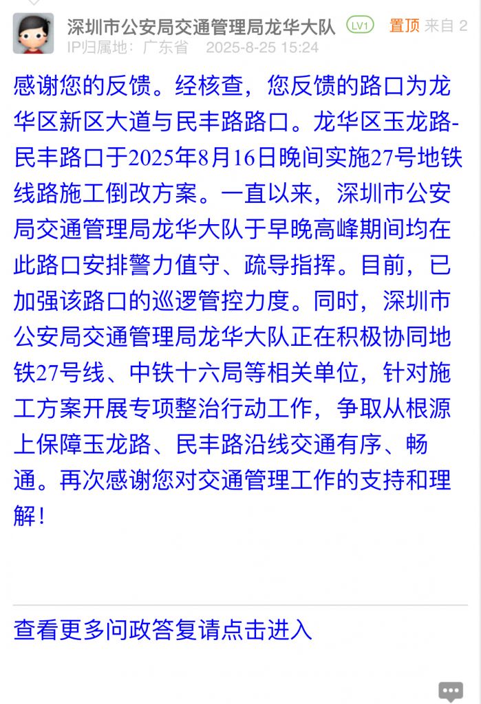感謝您的反饋。經(jīng)核查,您反饋的路口為龍華區(qū)新區(qū)大道與民豐路路口。龍華區(qū)玉龍路-民豐路口于2025年8月16日晚間實施27號地鐵線路施工倒改方案。一直以來,深圳市公安局交通管理局龍華大隊于早晚高峰期間均在此路口安排警力值守、疏導(dǎo)指揮。目前,已加強該路口的巡邏管控力度。同時,深圳市公安局交通管理局龍華大隊正在積極協(xié)同地鐵27號線、中鐵十六局等相關(guān)單位,針對施工方案開展專項整治行動工作,爭取從根源上保障玉龍路、民豐路沿線交通有序、暢通。再次感謝您對交通管理工作的支持和理解!