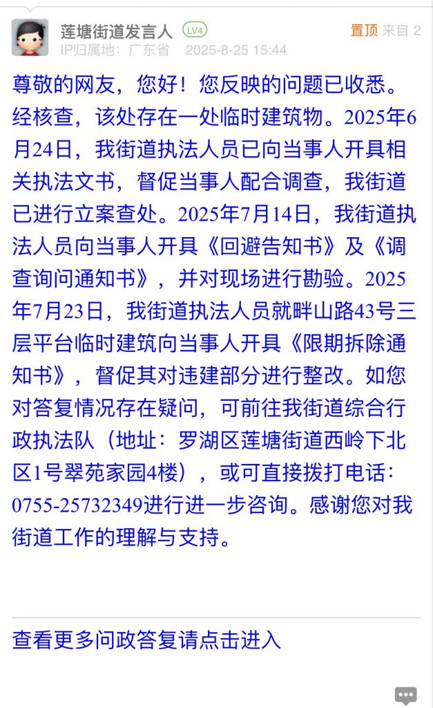 尊敬的網(wǎng)友,您好!您反映的問題已收悉。經(jīng)核查,該處存在一處臨時建筑物。2025年6月24日,我街道執(zhí)法人員已向當(dāng)事人開具相關(guān)執(zhí)法文書,督促當(dāng)事人配合調(diào)查,我街道已進(jìn)行立案查處。2025年7月14日,我街道執(zhí)法人員向當(dāng)事人開具《回避告知書》及《調(diào)查詢問通知書》,并對現(xiàn)場進(jìn)行勘驗。2025年7月23日,我街道執(zhí)法人員就畔山路43號三層平臺臨時建筑向當(dāng)事人開具《限期拆除通知書》,督促其對違建部分進(jìn)行整改。如您對答復(fù)情況存在疑問,可前往我街道綜合行政執(zhí)法隊(地址:羅湖區(qū)蓮塘街道西嶺下北區(qū)1號翠苑家園4樓),或可直接撥打電話:0755-25732349進(jìn)行進(jìn)一步咨詢。感謝您對我街道工作的理解與支持。